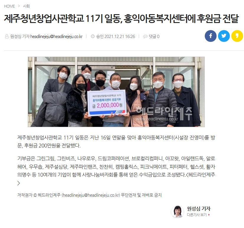 Á¦ÁÖû³ââ¾÷»ç°üÇб³ 11±â Àϵ¿, È«À;Ƶ¿º¹Áö¼¾ÅÍ¿¡ ÈÄ¿ø±Ý Àü´Þ